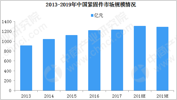 近年來我國緊固件行業(yè)保持較快發(fā)展,產(chǎn)量、銷量和國有化程度不斷提高。緊固件廣泛應(yīng)用各種機(jī)械、設(shè)備、車輛、船舶、鐵路、橋梁、建筑、結(jié)構(gòu)、工具及儀器儀表等領(lǐng)域,與裝備制造業(yè)的發(fā)展緊密相關(guān)。隨著我國經(jīng)濟(jì)穩(wěn)定發(fā)展,緊固件下游產(chǎn)業(yè)需求持續(xù)提高,以及國家政策的大力支持,緊固件市場規(guī)模將繼續(xù)保持上升,2019年,中國緊固件的總體市場規(guī)模將達(dá)到1380億元。