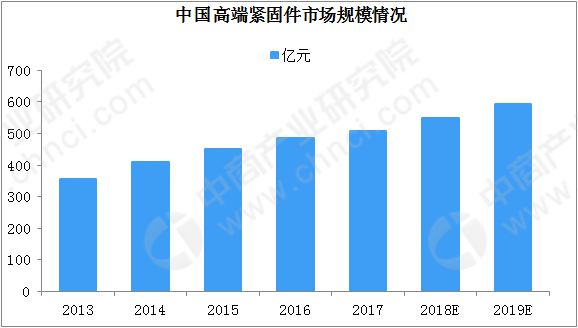 高端緊固件主要集中在航空航天、高鐵、風(fēng)電、核電、汽車及船舶等領(lǐng)域,此領(lǐng)域多屬于我國高端裝備制造業(yè)。近年來,我國高端裝備制造業(yè)發(fā)展迅速,帶動(dòng)高端緊固件制造業(yè)穩(wěn)定發(fā)展,早在2013年,我國智能制造、高速軌道交通、海洋工程等高端裝備制造業(yè)產(chǎn)值占裝備制造業(yè)比重已經(jīng)超過10%。高端裝備制造業(yè)處于價(jià)值鏈高端和產(chǎn)業(yè)鏈核心環(huán)節(jié),決定著整個(gè)產(chǎn)業(yè)鏈綜合競爭力的戰(zhàn)略性新興產(chǎn)業(yè),是我國產(chǎn)業(yè)核心競爭力的體現(xiàn),得到國家大力支持。高端緊固件市場規(guī)模將伴隨著航空航天、衛(wèi)星及應(yīng)用、軌道交通裝備、海洋工程裝備、核電、風(fēng)電以及汽車等行業(yè)的快速發(fā)展而持續(xù)走高,2019年,中國高端緊固件市場規(guī)模將達(dá)到590億元。